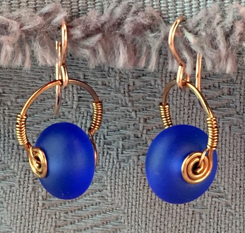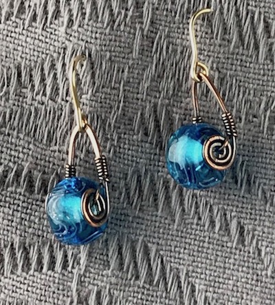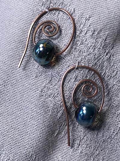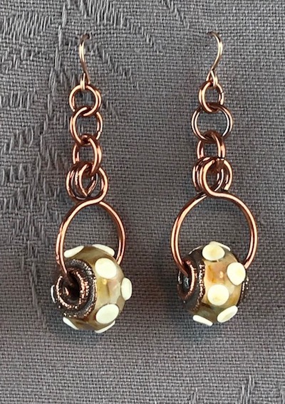 Copper wirework and 14/20 Gold Filled earwires. Relatively heavy: not for sensitive ears.