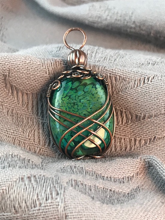 "Faux Jade" bead set in copper wire weaving "Criss Cross" style.