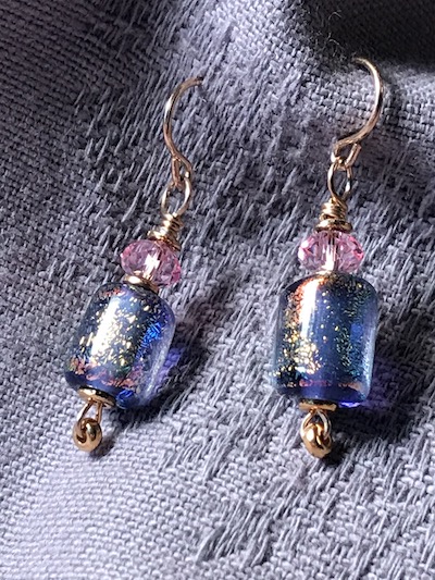 Dichroic "Twins" accented with pink Swarovski crystals. 14/20 Gold Filled wirework and earwires.
