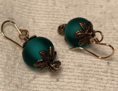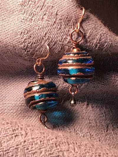 Copper wirework and 14/20 Gold Filled earwires. Relatively heavy: not for sensitive ears.