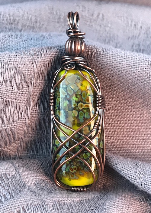 Mustard yellow "Lichen" bead. Copper wire weaving "Criss Cross" style.