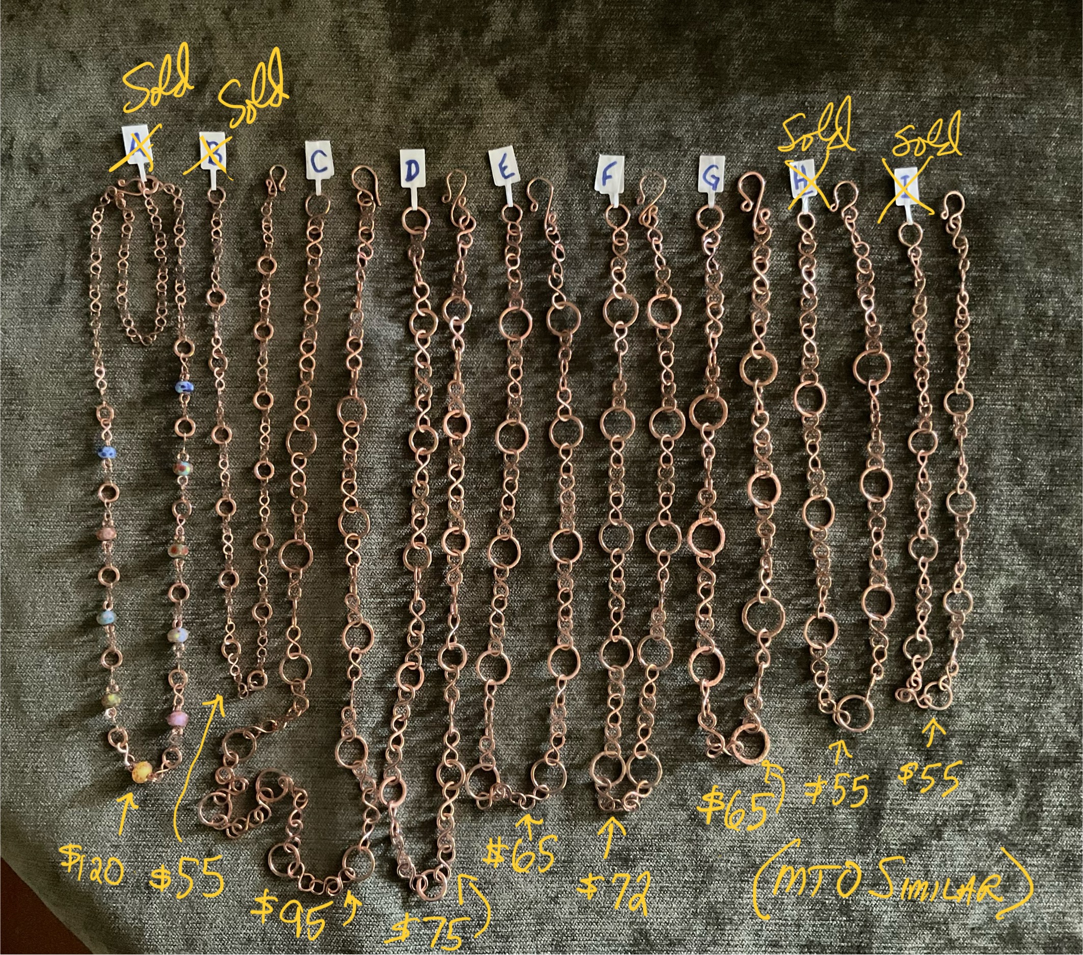 Measuring 24 inches long. 14 gauge “Circles”. 16 gauge “Infinity” Links. (Approx $5/inch)